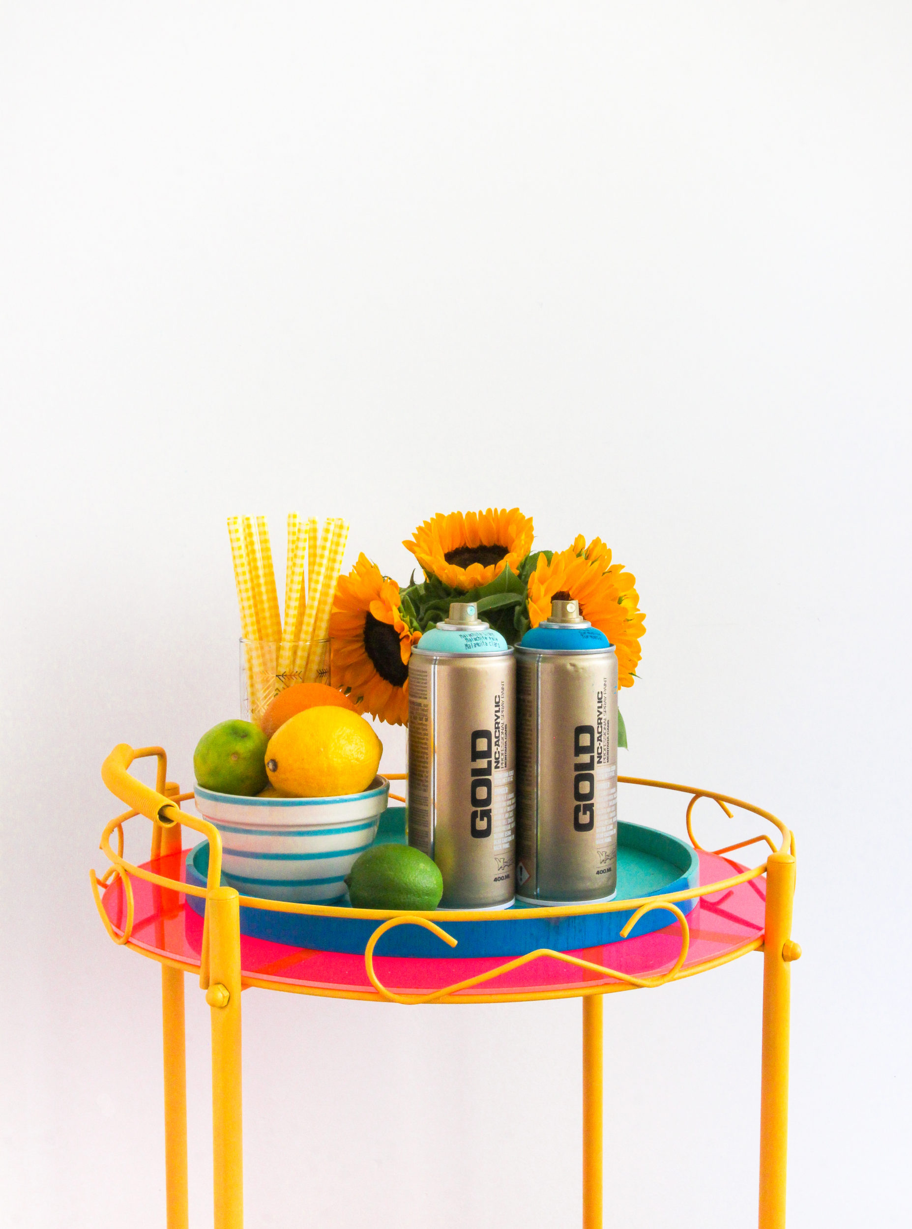 Apply your primer 20-30 cm’s away from your cart, and move in sweeping strokes from left to right as you spray. This will prevent too much paint applying and drips forming. Once dry, take your Montana GOLD 400ml can (we used Yellow Cab), and repeat this process for 2 or more, thin, even coats. Allow drying thoroughly for 24 or more hours to cure. We chose to apply a Montana VARNISH to seal the surface and protect it further from scratching or marking. You can decide which finish to use (Gloss, Semi Gloss or Matte), as long as the paint was completely dry before you applied it. Your basis is done and already your cart has a cool new look, you just got closer to finishing your Bar Cart Makeover.
